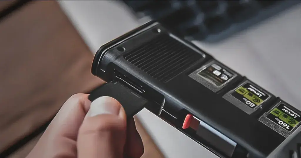 มีช่องสำหรับใส่การ์ด 2 ช่อง ทั้งช่องสำหรับการ์ด CFexpress และช่องสำหรับการ์ด SD/Micro SD