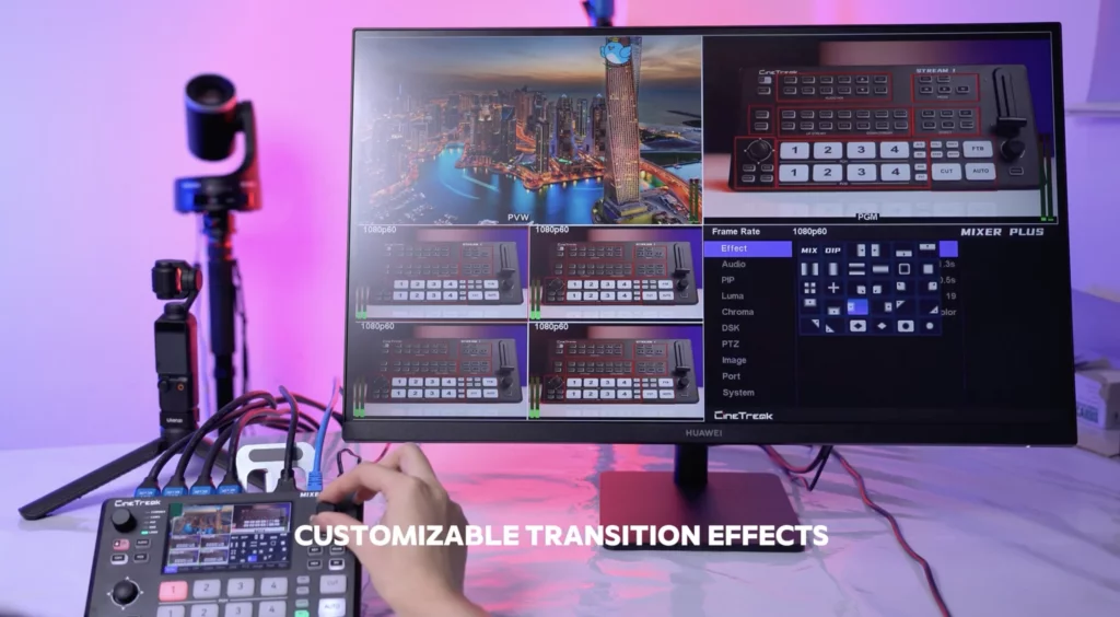 หลายครั้งที่ไลฟ์ดูธรรมดาเกินไป ไม่ใช่เพราะเนื้อหา แต่เป็นเพราะการเปลี่ยนช็อตที่แข็งหรือสะดุดเกินไป Mixer Plus ช่วยแก้จุดนี้ด้วย ทรานซิชันให้เลือกถึง 30 รูปแบบ ไม่ว่าจะเป็น Mix หรือ DIP ทำให้การสลับกล้องดูเนียนขึ้นแบบรู้สึกได้จากที่ใช้งานจริง ทรานซิชันพวกนี้ช่วยให้ไลฟ์ดูมีจังหวะ มีอารมณ์มากขึ้น โดยเฉพาะงานสัมภาษณ์ ไลฟ์ขายของ หรืออีเวนต์ออนไลน์ การเปลี่ยนภาพที่ลื่นและดูโปร ทำให้ภาพรวมของงานดูแพงขึ้นทันที โดยไม่ต้องพึ่งซอฟต์แวร์เสริมให้ยุ่งยาก