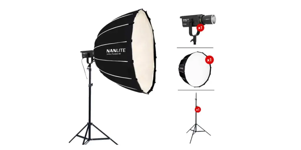 FS-60B SET มาพร้อมกับไฟสตูดิโอ FS-60B จำนวน 1 ตัว / Parabolic Softbox ขนาด 90 เซนติเมตร จำนวน 1 ตัว / และขาตั้งไฟโช๊คลม จำนวน 1 ตัว