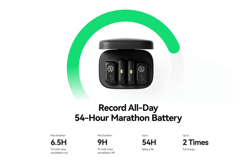 ถ่ายทำคอนเทนต์ได้ต่อเนื่องตลอดทั้งวันโดยไม่ต้องกังวลเรื่องแบตหมด เพราะไมค์ตัวนี้สามารถใช้งานต่อเนื่องได้ถึง 9 ชั่วโมง (โดยไม่ใช้ฟีเจอร์ตัดเสียงรบกวน) ซึ่งสามารถสลับกันใช้กับตัวส่ง (TX) ที่มีมาให้ถึง 2 ตัว ซึ่งแต่ละตัวสามารถนำไปชาร์จในเคสจนเต็มได้สูงสุดอีกตัวละ 2 ครั้ง รวมเป็นระยะเวลาการใช้งานทั้งหมด 52 ชั่วโมง
