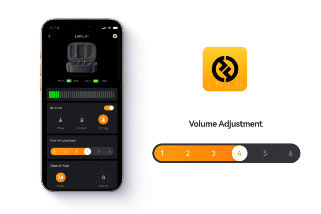 ในระหว่างการถ่ายทำคอนเทนต์ ไม่ว่าระดับเสียงของเราจะเบาหรือดังเกินไป เราก็สามารถปรับแต่งให้พอดีได้อย่างว่องไวด้วยแอปพลิเคชัน LarkSound ซึ่งเราสามารถเลือกปรับได้ถึง 6 ระดับ ช่วยให้เราสามารถปรับความดังของเสียงให้เหมาะสมที่สุดในทุกสถานการณ์