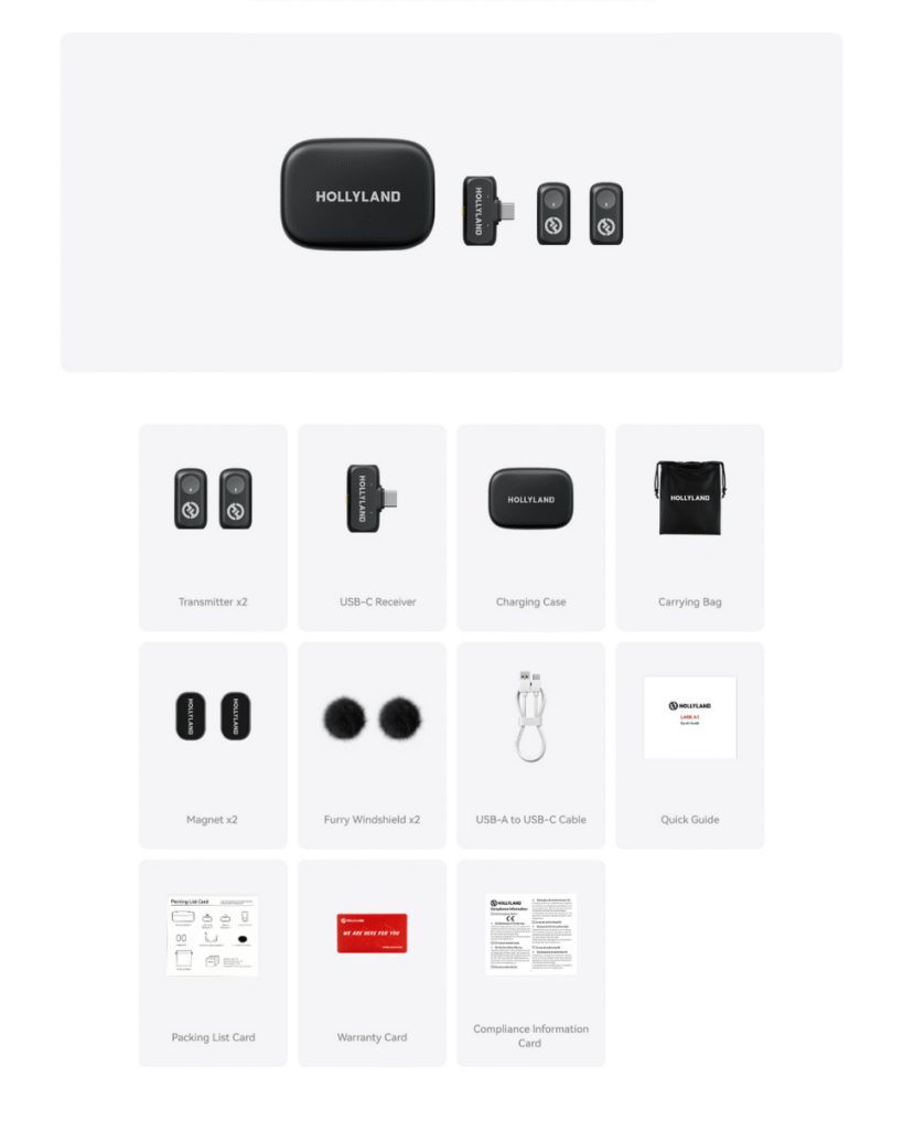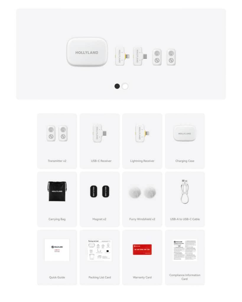 ประกอบไปด้วย: Transmitter x2 / USB-C Receiver x1 / Lightning Receiver x1 / Charging Case x1 / Carrying Bag x1 / Magnet x2 / Furry Windshield x2 / USB-A to USB-C Cable x1