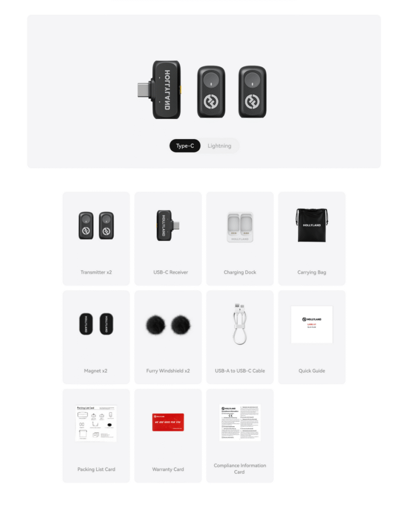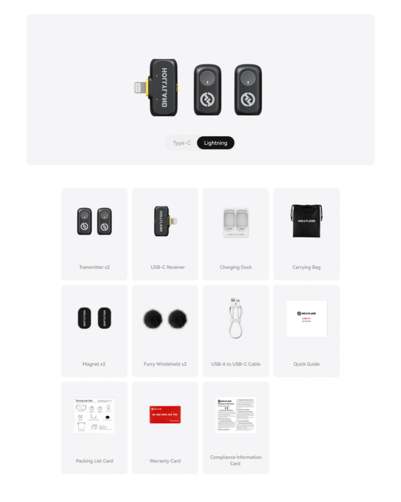 ประกอบไปด้วย: Transmitter x2 / Lightning Receiver x1 / Charging Deck x1 / Carrying Bag x1 / Magnet x2 / Furry Windshield x2 / USB-A to USB-C Cable x1