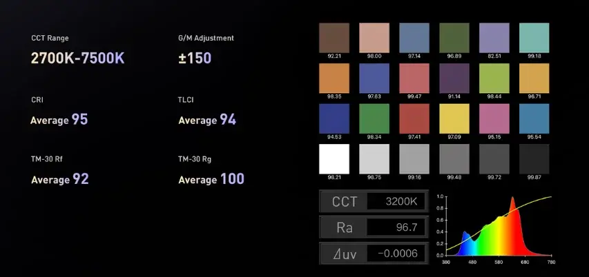 ไฟรุ่นนี้มาพร้อมกับเทคโนโลยีการผสมสีแบบ RGBW ที่พัฒนามาจาก Nanlite โดยตรง ส่งผลให้เราสามารถปรับแต่งสีสันของแสงได้ละเอียดยิ๊บ สามารถปรับอุณหภูมิสีได้ตั้งแต่ 2700K-7500K (G/M±150) พร้อมด้วยค่า CRI,TLCI ที่ 95, 97