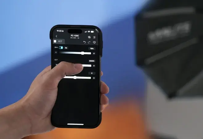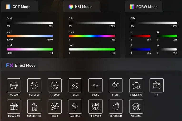 FC-120C มาพร้อมโหมดแสงในตัวถึง 4 โหมด ได้แก่ CCT, HSI, RGBW และ FX Effect Mode โดยเราสามารถควบคุมโหมดต่าง ๆ ได้จากตัวเครื่อง และแอปพลิเคชัน Nanlink App