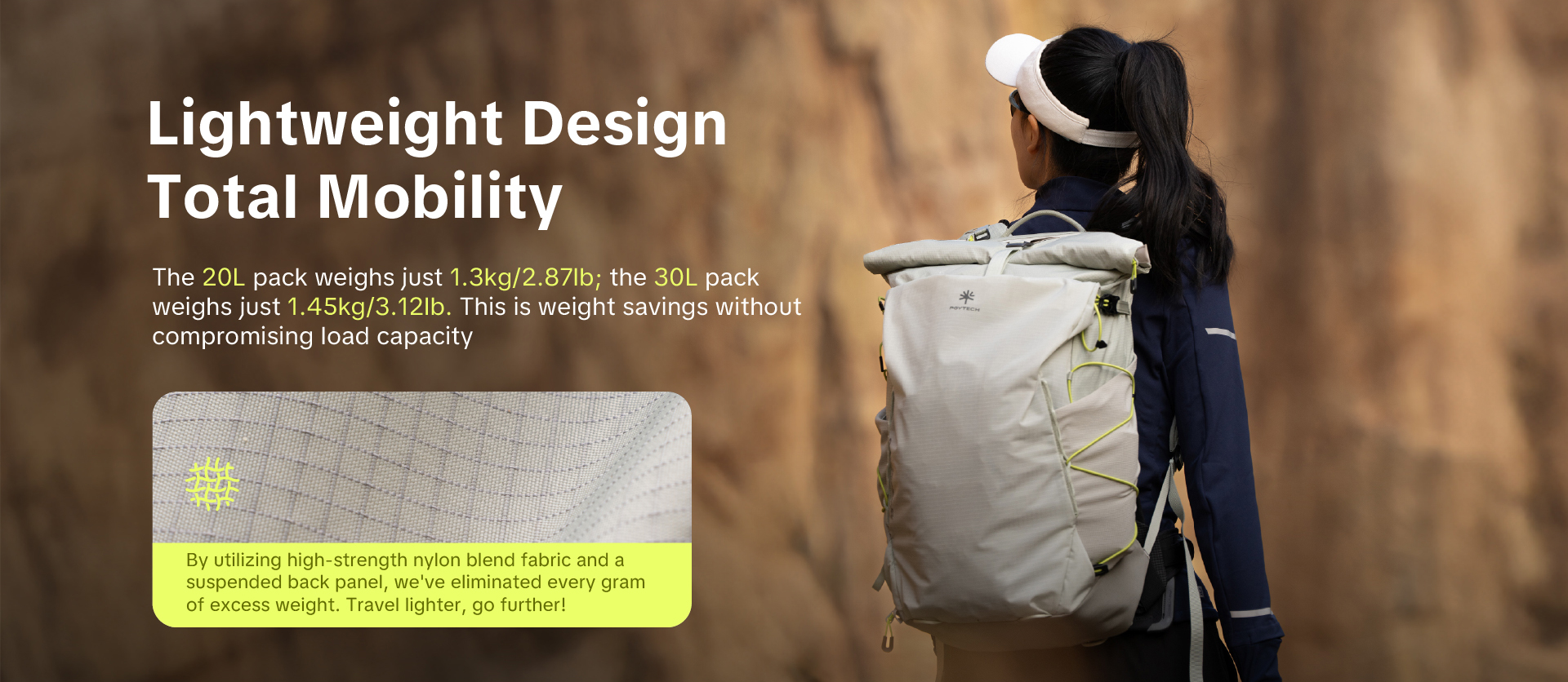 ความลับของน้ำหนักตัวที่เบา (เริ่มต้นเพียง 1.3 กิโลกรัม ในรุ่น 20L) ไม่ใช่การลดเกรดวัสดุ แต่คือการเลือกใช้วัสดุ High-Strength Nylon Blend ที่ผ่านการทอแบบพิเศษให้ทนทานต่อแรงฉีกขาด หรือ Tear Resistance สูงกว่าผ้าไนลอนทั่วไป