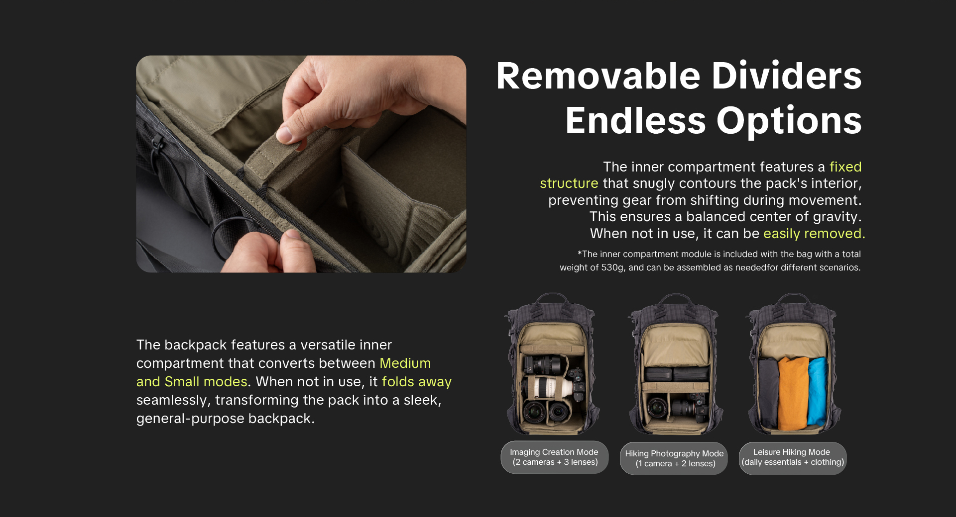 แผ่นกั้นกันกระแทกด้านในไม่ได้มีไว้แค่แบ่ง แต่มันคือระบบ Modular ที่ปรับเปลี่ยนได้อิสระมาก แผ่นกั้นสามารถพับงอเพื่อหลบเลนส์ซูมยาวๆ หรือพับเก็บแนบผนังกระเป๋าไปเลยเมื่อต้องการพื้นที่โล่งๆ สำหรับใส่เสื้อผ้า