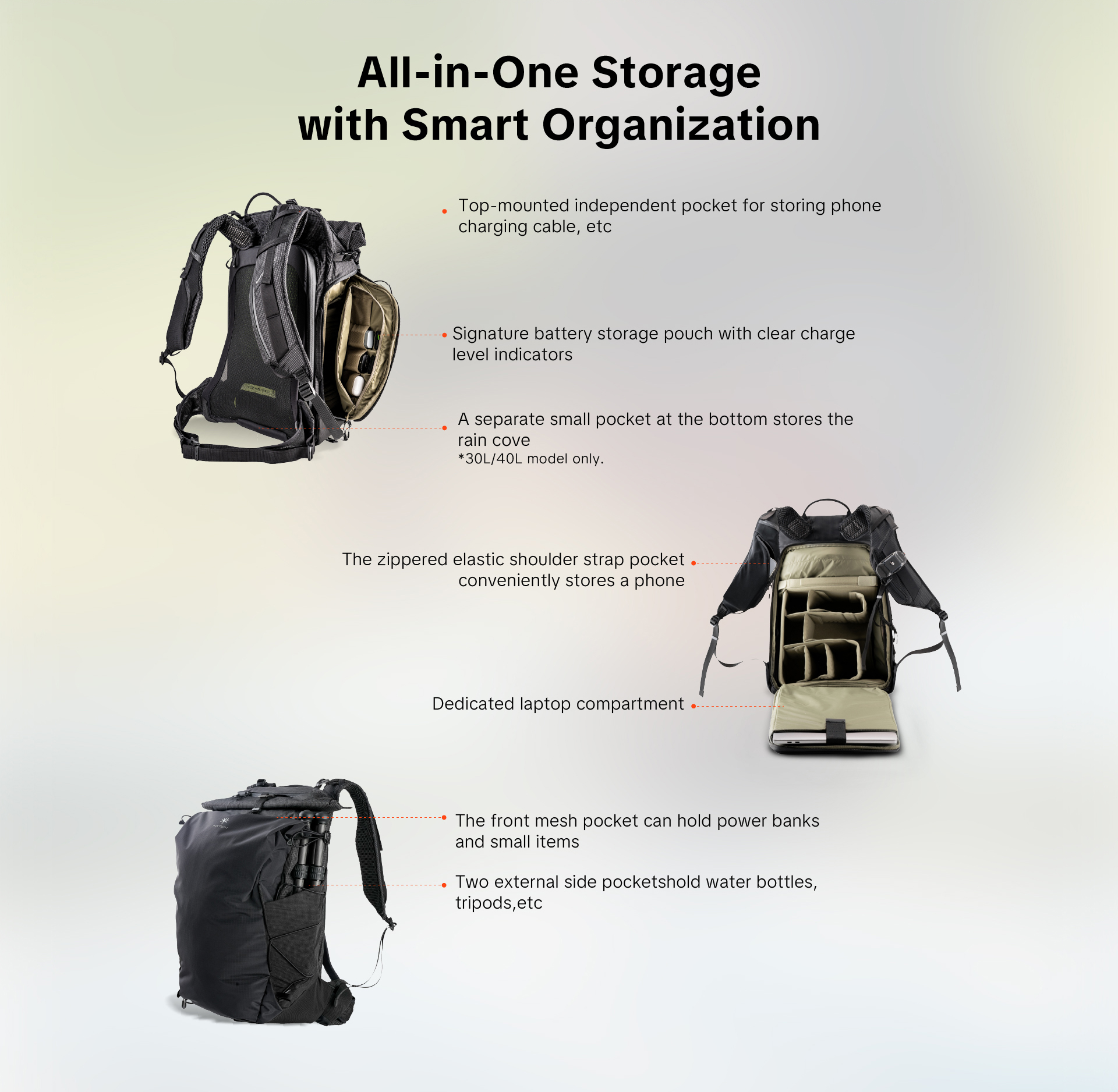 - Front Kangaroo Pocket ช่องหน้าสามารถขยายออกได้ รองรับ Gimbal ขนาดเล็ก เสื้อกันฝน หรือแม้แต่ Hydration Bladder ถุงน้ำสำหรับเดินป่า