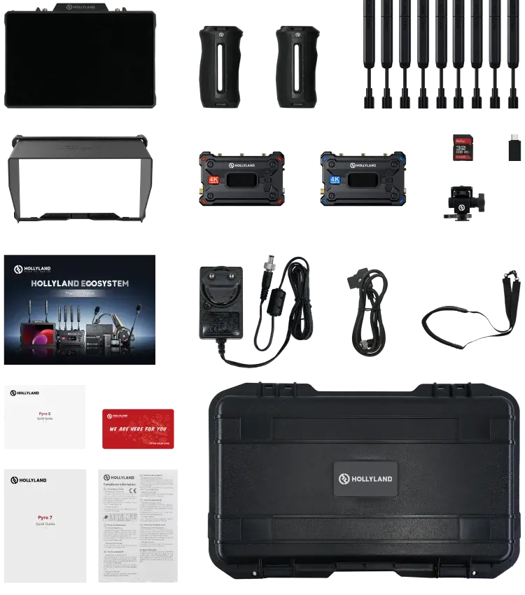 ชุดนี้ประกอบด้วยอุปกรณ์ 3 ชิ้นหลัก คือ Hollyland Pyro 7 Wireless Transceiving Monitor ที่ทำหน้าที่เป็นทั้งมอนิเตอร์และระบบส่งรับสัญญาณ, Hollyland Pyro S Wireless Video Transmitter ที่เป็นเครื่องส่งสัญญาณโดยเฉพาะ และ Hollyland Pyro S Wireless Video Receiver ที่เป็นเครื่องรับสัญญาณ ความหลากหลายของชุดนี้ให้ความยืดหยุ่นในการใช้งานแบบต่างๆ ตามความต้องการของแต่ละโปรเจ็กต์