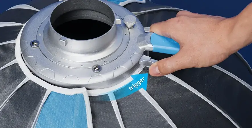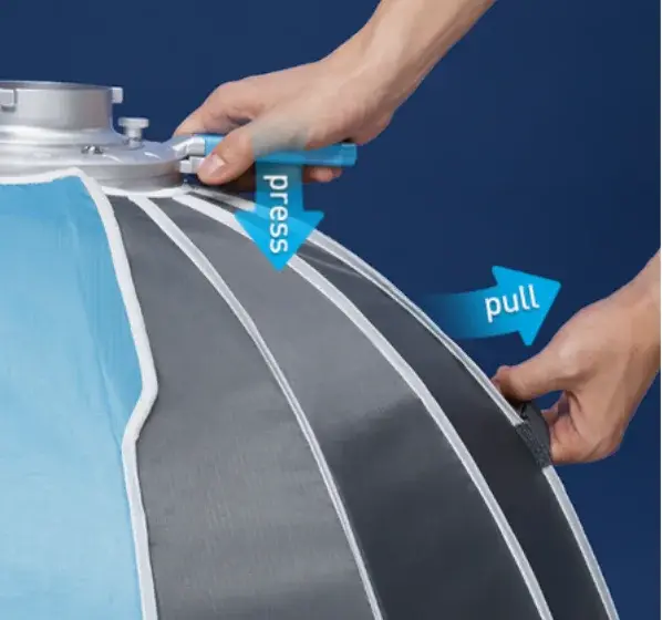 “Nanlite Rapid Parabolic Softbox” มาพร้อมกับนวัตกรรม “สลักล็อกไว” ซึ่งช่วยให้เราสามารถกางซอฟต์บ็อกซ์รุ่นนี้ให้พร้อมใช้งานได้อย่างรวดเร็วภายใน 5 วินาที โดยมีขั้นตอนง่าย ๆ ก็คือการกดที่บริเวณด้ามจับและทำการดึงเพื่อกางซอฟต์บ็อกซ์ออกมา